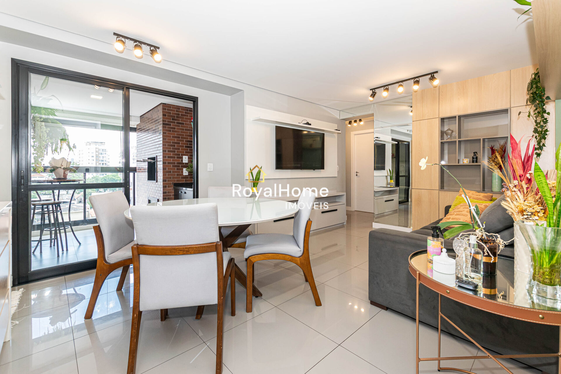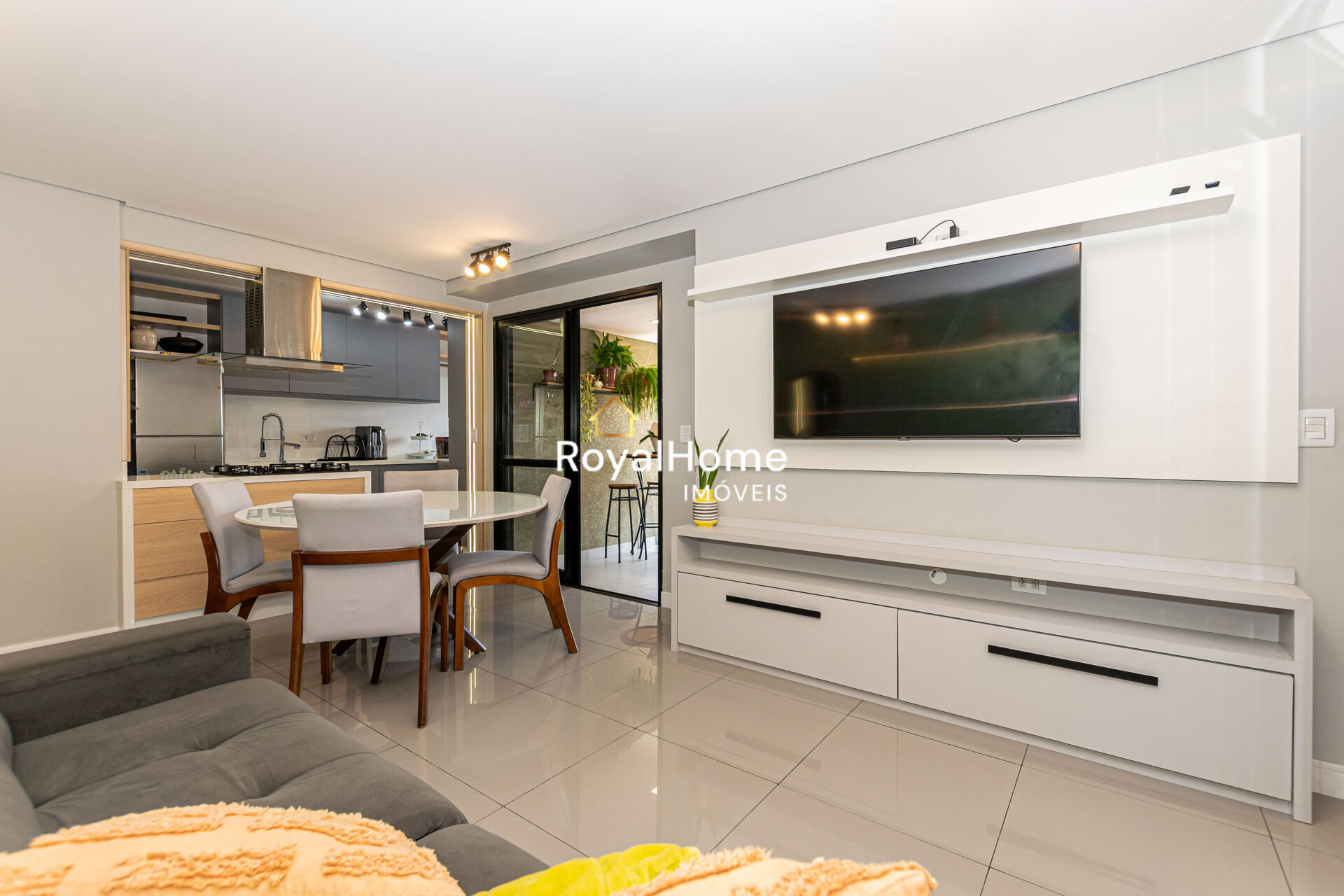 - Living para 02 ambientes estar/jantar elegante, com painel de MDF do chão ao teto